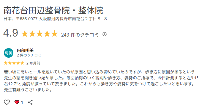 を受けた後、「ゆるかかと歩き」を実践し、外反母趾が改善された方からグーグルMAPにレビュー投稿を頂きました。