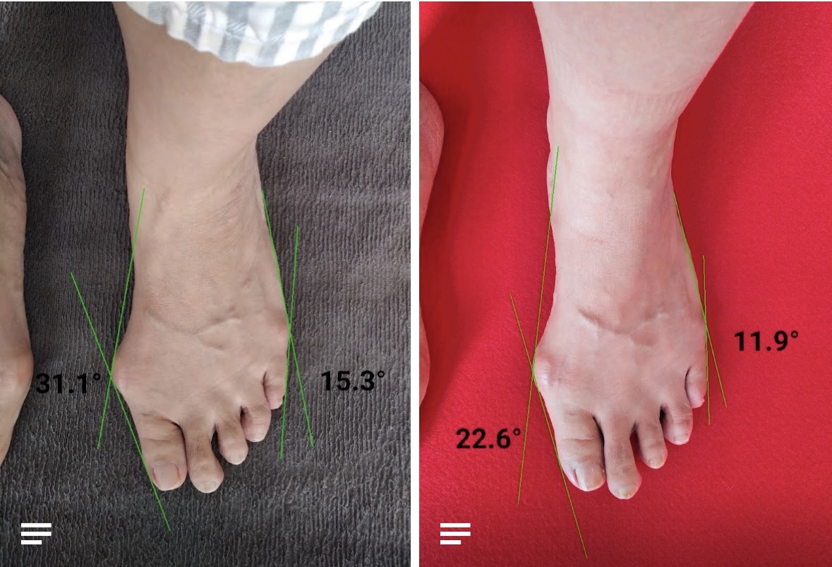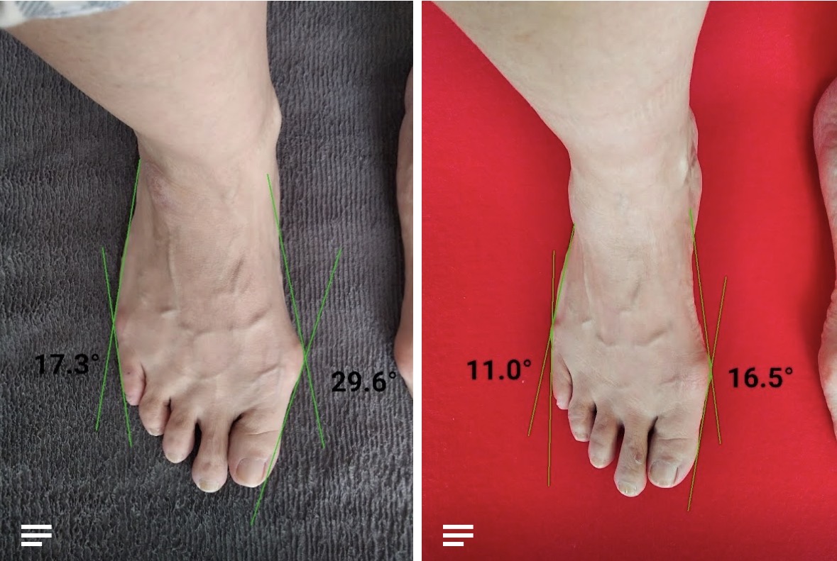 2か月ほどの短期間でしたが、外反母趾は左足33.2°→28.3°(-4.9°)右足32.0°→29.9°(-2.1°)